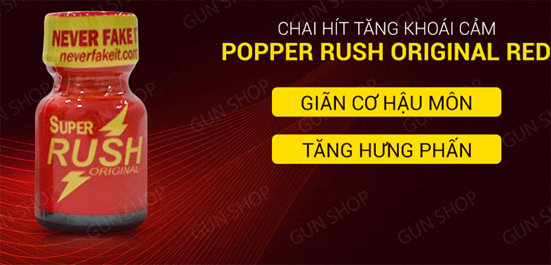 - Thông tin: Chai hít kích thích nam và nữ Popper Rush Original Red là một trong những dòng popper lâu đời nhất tại Mỹ. Sản phẩm nhận được sự tín nhiệm hùng hậu của cộng đồng LGBT tại những khu vực Châu Mỹ, Nam Mỹ. Không chỉ sở hữu mùi hương nhẹ nhàng, dễ chịu, không hắc, siêu phẩm này còn có tác dụng nhanh chóng và cực mạnh mẽ. Mang lại khả năng kéo dài thời gian phê pha, thúc đẩy những cơn cực khoái sung sướng tê dại, chuyện “yêu” cũng vì thế mà sung mãn hơn.