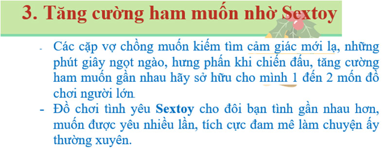- Việc dùng sex toy khi ấy được hiểu như hình thức “một mình”. Tuy nhiên, cùng với sự cởi mở hơn trong tư tưởng về những vấn đề tế nhị chốn phòng the, nhiều cặp vợ chồng sẵn sàng thử dùng sex toy để tăng cảm hứng và sự mới mẻ cho nhau.