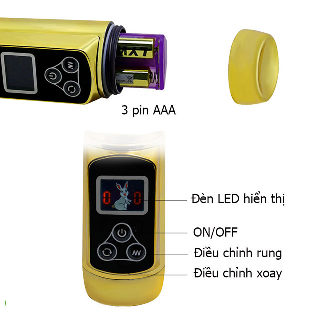 - Chim giả Passion hoạt động rất đơn giản nên sử dụng cũng thế, bạn chỉ cần lắp 3 pin AAA vào và khởi động nó lên là được. Bạn hãy nhìn vào bộ điều khiển nằm bên dưới sẽ thấy có đến 3 nút điều khiển, trong đó có một nút điều chỉnh chế độ rung của dương vật, 2 nút còn lại dùng để điều chỉnh chế độ xoay và ngoáy của chim giả này.