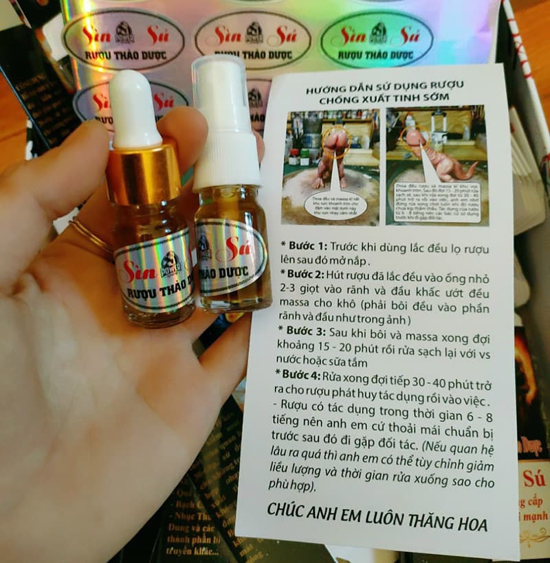 Bước 2: Hút rượu đã lắc đều vào ống nhỏ 2-3 giọt vào rãnh và đầu khấc dương vật ướt đều massage cho khô (phải bôi đều phần rãnh và đầu khấc)